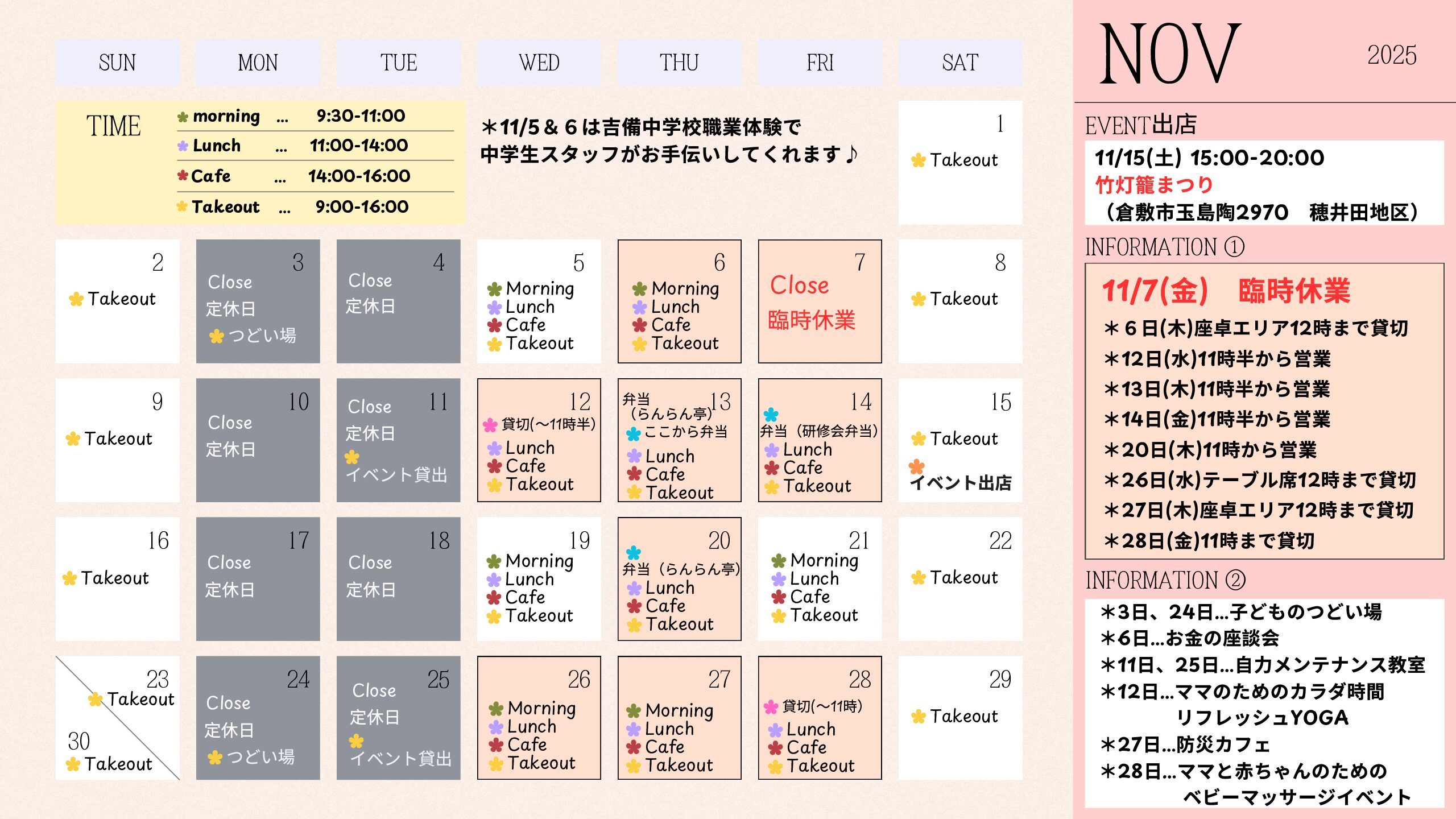 ぬるま湯キッチン営業日のお知らせ【11月】 2025 11/02 公園からのお知らせ 2025年11月2日 ぬるま湯キッチンの営業日をお知らせいたします。 公園からのお知らせ よかったらシェアしてね! URLをコピーしました! URLをコピーしました! マッサージチェア設置のお知らせ