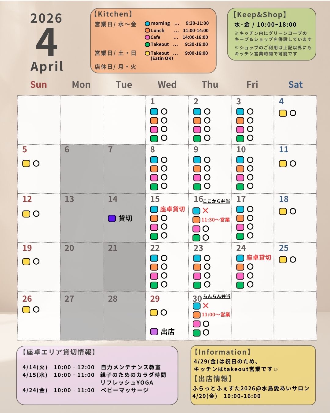 ぬるま湯キッチン営業日のお知らせ【4月】 2026 3/28 公園からのお知らせ 2026年3月28日 ぬるま湯キッチンの営業日をお知らせいたします。 公園からのお知らせ よかったらシェアしてね! URLをコピーしました! URLをコピーしました! 駐車場料金改定のお知らせ