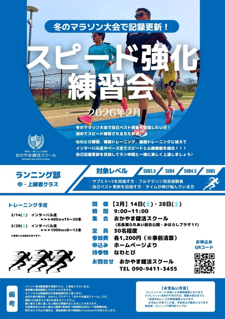 おかやま健活スクールからお知らせです。 ランニング初心者大歓迎!基礎から走りを学んでみませんか?歩きから始めて1 …