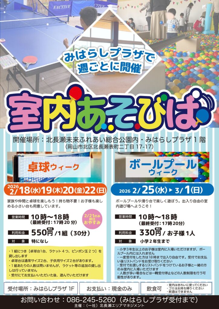 みはらしプラザで室内あそびばを開催します。 家族や仲間と卓球を楽しもう! 持ち物不要!お子様も楽しめる小さ …