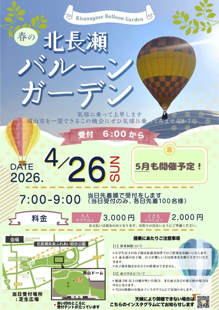 北長瀬未来ふれあい総合公園で、気球搭乗イベントを開催します!気球に乗って北長瀬や岡山市を見渡そう!気球に乗れるこの機会 …
