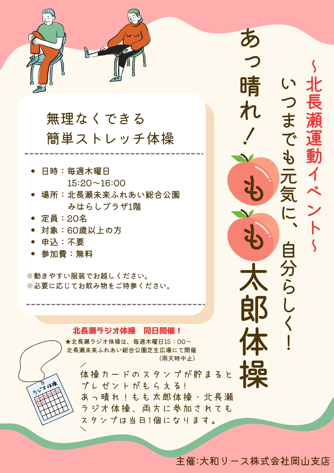 毎週木曜日、北長瀬未来ふれあい総合公園みはらしプラザ1階にて、あっ晴れ!もも太郎体操を開催します。