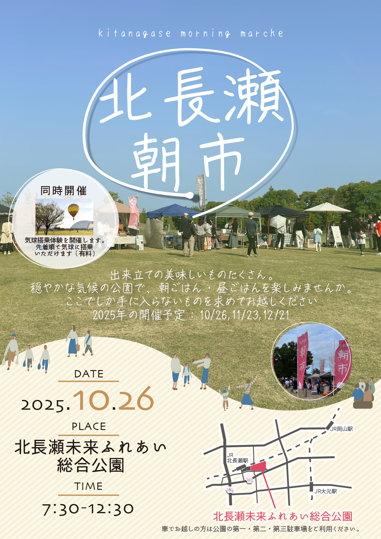 北長瀬朝市 2025 10/26 公園全体 2025.09.02 北長瀬で朝市を開催します! 出来立てのおいしいものたくさん、心を込めた手作り品 ここでしか手に入らないものを求めてぜひお越しください。 【開催日時】 10月26日(日) 7:30~12:30 【開催場所】 北長瀬未来ふれあい総合公園 芝生広場 公園全体 よかったらシェアしてね! URLをコピーしました! URLをコピーしました! みはらしの丘で星を見よう 北長瀬もんげーフリーマーケット
