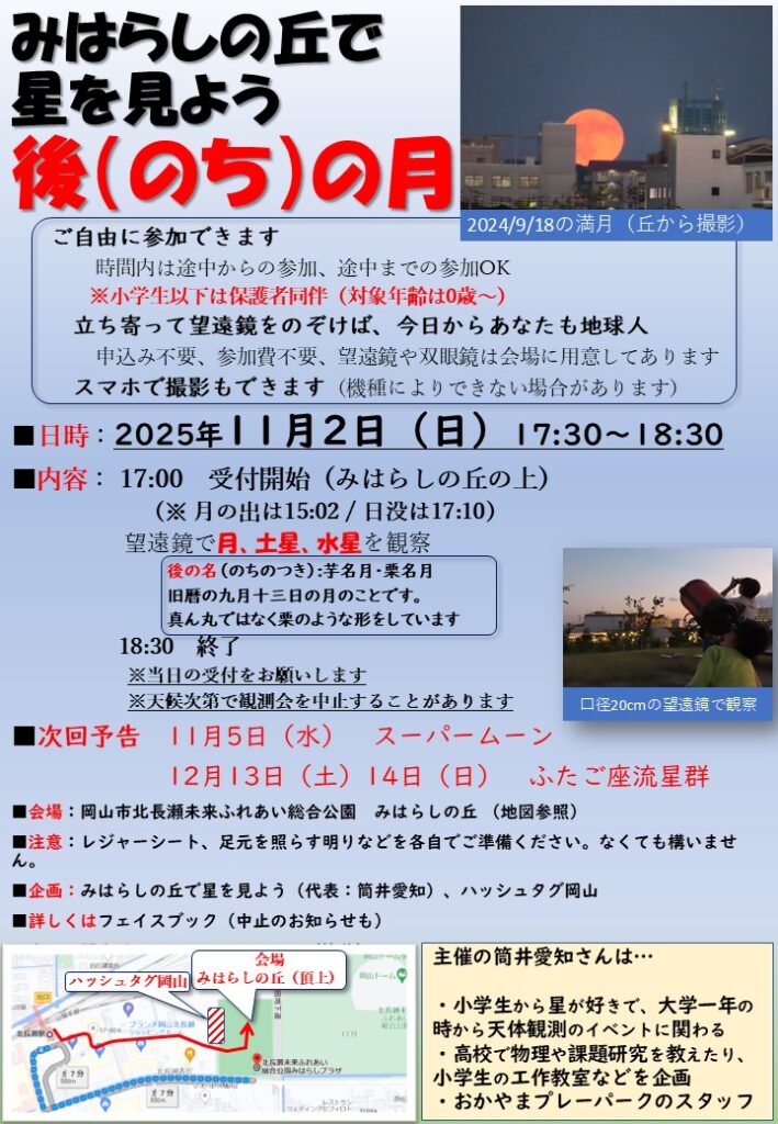 市街地では珍しい、360度視界の開けたみはらしの丘で、天体観測を楽しみましょう 望遠鏡、双眼鏡、デジタル観望機器を用いて、月のクレーターや土星の環、星座や星雲などをのんびりと見るイベントです 【開催日時】 11月2日(日) 17:30~18:30 【開催... -