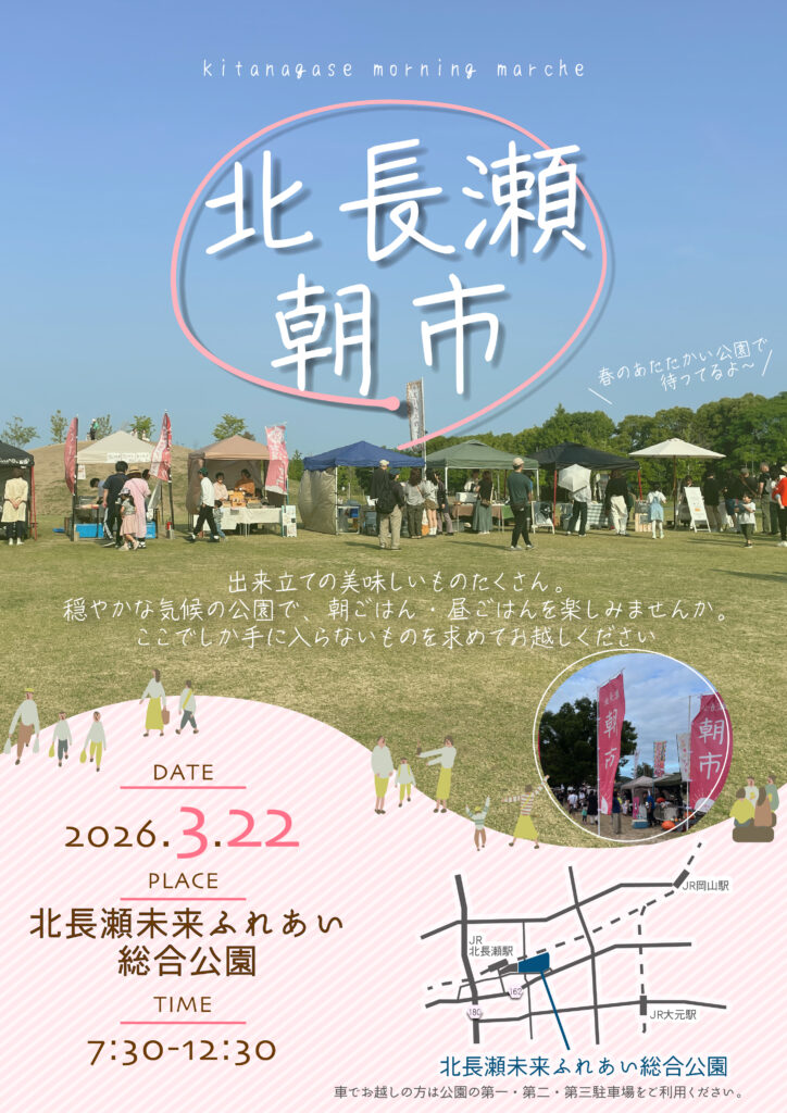 北長瀬で朝市を開催します! 出来立てのおいしいものたくさん、心を込めた手作り品 ここでしか手に入らないものを求めてぜひお越しください。 【開催日時】 3月22日(日) 7:30~12:30 【開催場所】 北長瀬未来ふれあい総合公園 芝生広場 ※ブラン... -